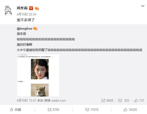 该网友还晒出一则周冬雨和藏狐的对比图,看上去十分神似,令人捧腹。