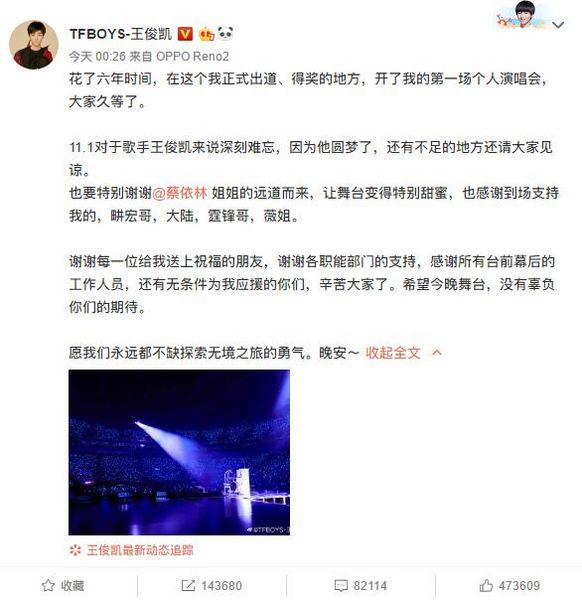 11月1日,王俊凯在北京五棵松完成出道以来首场个人演唱会,演唱会结束后他在微博发长文称“花了六年时间,在这个我正式出道、得奖的地方,开了我的第一场个人演唱会,大家久等了。”全文