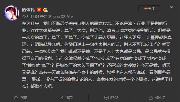 热依扎在文中写道:“我的转发就到这里。让大家看看人类躲在网络后面,没有实名的情况下,人性可以阴暗、丑陋到什么层面。然后,我告诉你们,你们泼的脏水 ,压不到我的!你让我退圈?不可能!除非是我自愿!我在这行业一天我就恶心你一天!现在,我要去吃饭了,我还就好好活着让你们这些小人难受。王朔曾说过,“小人得罪就得罪了,小人得罪光了才好呢!”这就是我面对你们的勇气!有一天大街上遇到我,有本事当面侮辱我!没准在现实生活里你们都一个个纯良的要死!”