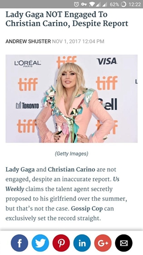 在US weekly独家报道Lady gaga订婚之后,Gossip Cop发文称gaga与男友没有订婚,而且称已经联系了gaga的发言人表示没有此事。